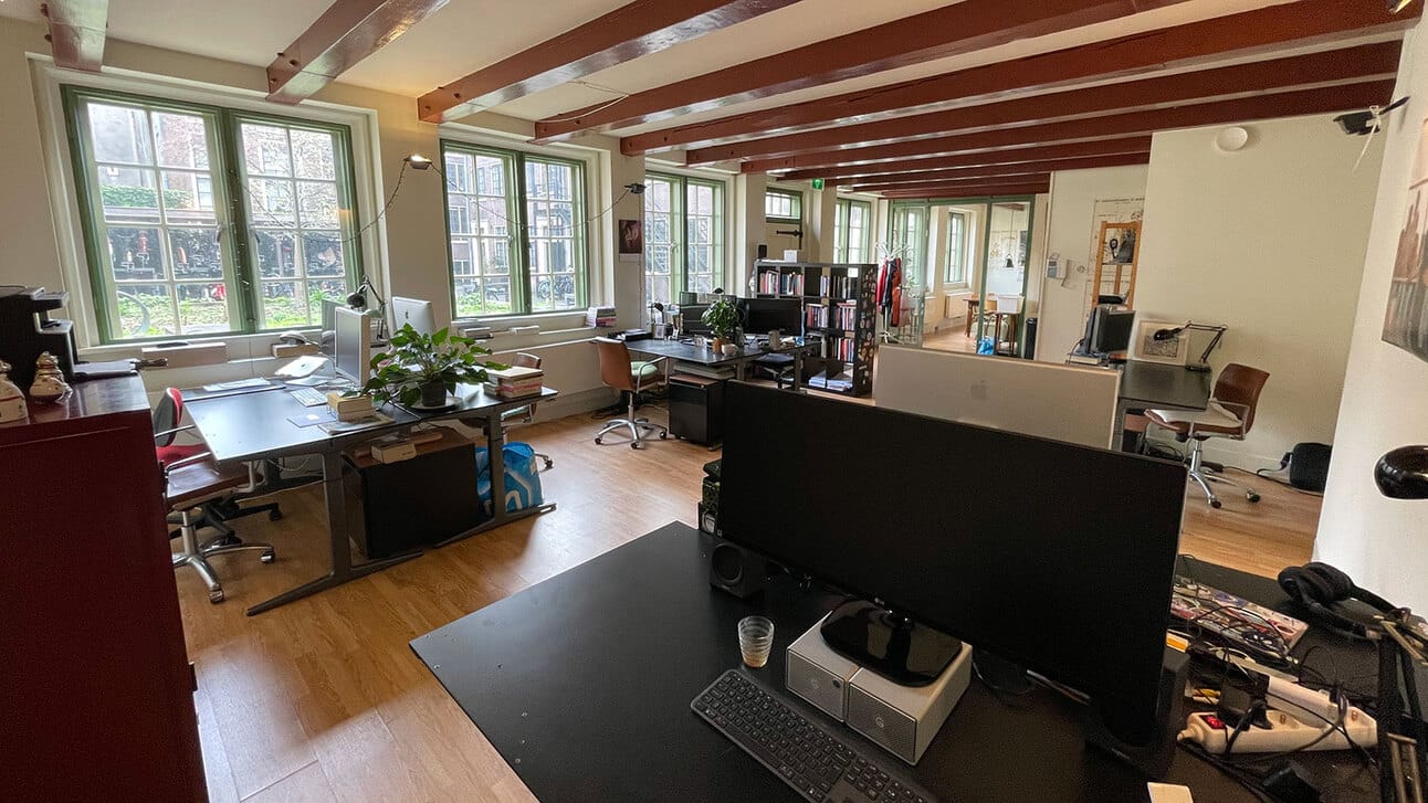 Werken op de burelen van De Circulaire, wie wil dat nou niet? In het kantoor dat ik deel met zes andere freelancers is per direct een bureau vrij. We zitten aan de Lauriergracht in Amsterdam, midden in de Jordaan, in een mooi oud pand op de begane grond. We zitten aan een hofje, dus er zijn geen straatgeluiden, en in het hofje zijn picknicktafels waar je in de zomer heerlijk in de zon kunt lunchen. Verder hebben we een keukentje met een koelkast en een ruime vergaderruimte die je gratis kunt reserveren. Een bureau kost €240 per maand (geen BTW) en ongeveer een tientje per maand aan schoonmaakkosten.