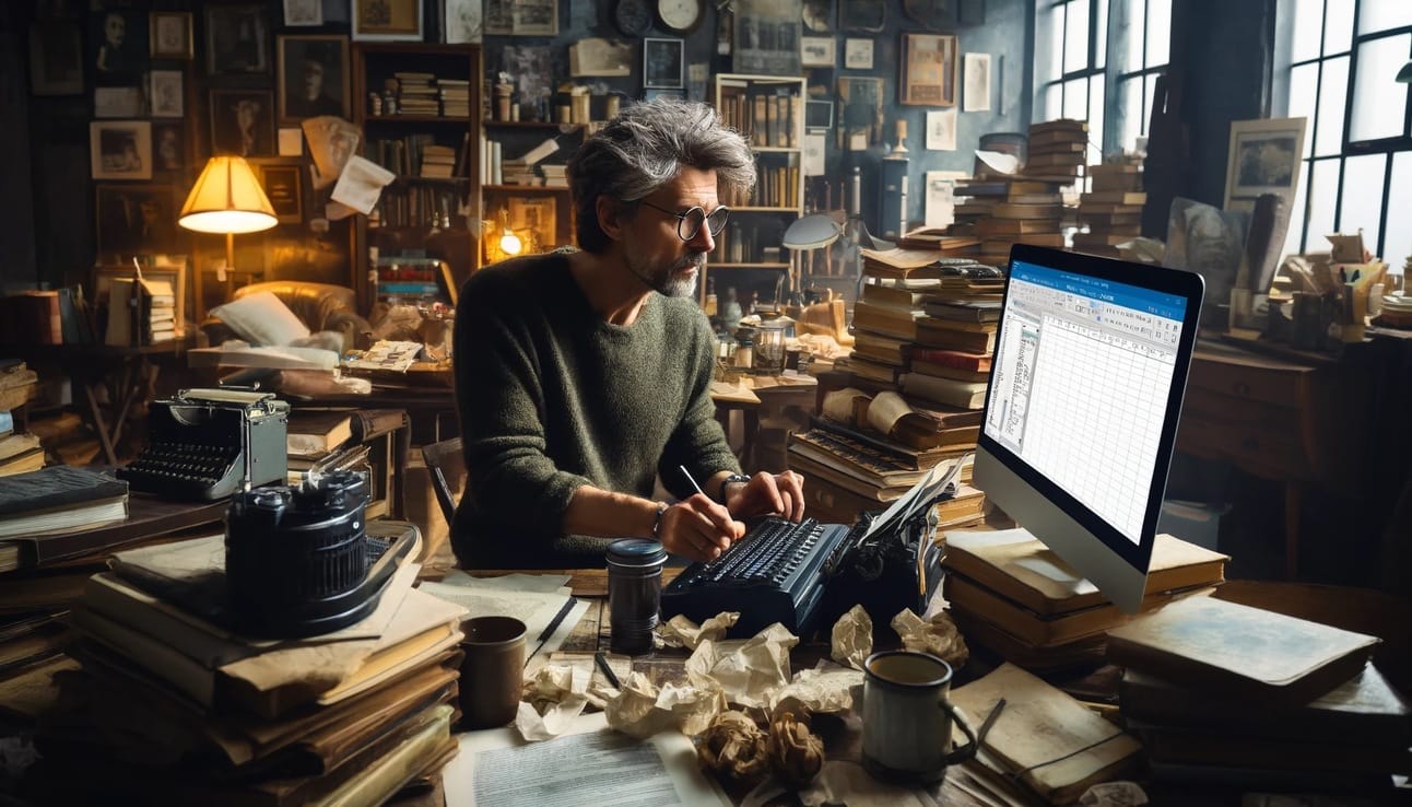 Een schrijver die met Excel bedenkt hoe hij zijn volgende boek moet schrijven. Heeft ChatGPT er ondanks mijn algemene beschrijving toch weer een witte man van gemaakt? Natuurlijk. 📷 ChatGPT dus
